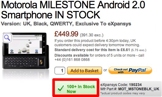 Motorola’s MILESTONE – aka the GSM DROID – is finally in stock at Expansys UK. The retailer currently holds the exclusivity agreement for the smartphone, which means UK buyers won’t be seeing the Android 2.0 device in retail stores on the highstreet any time soon. It’s priced at £449.99 ($732) unlocked, though Expansys are also happy to sell you a subsidized model with contract.